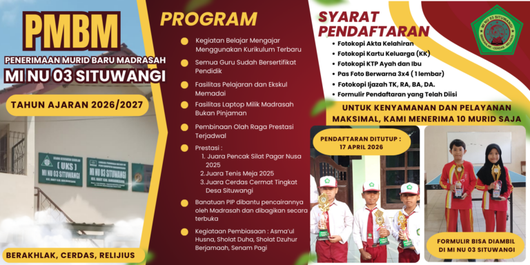 Telah dibuka penerimaan Murid Baru Madrasah MI NU 03 Situwangi Tahun Ajaran 2026 / 2027 degan ketentuan sebagai berikut :